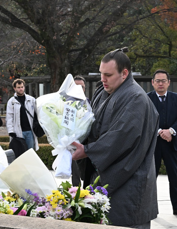 大相撲九州場所で初優勝し、大関に昇進したウクライナ出身の安青錦らが10日、広島市の平和記念公園で原爆犠牲者らを悼み献花した。献花は同日の冬巡業「広島場所」に先立ち、被爆80年に合わせて企画された。 【時事通信社】